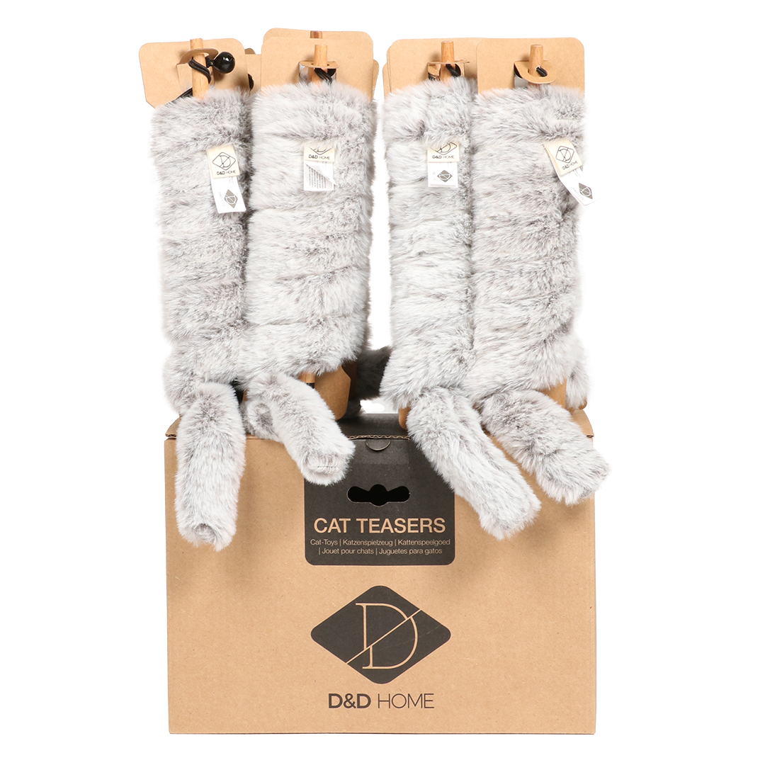 La barra para gatos D&D HOME Lovi es una elegante barra para gatos hecha de piel sintética en dos colores. La piel se llama ‘piel de lobo’ porque los pelos son tonos de gris y negro. La caña tiene una cola extra larga de no menos de 85 cm de largo para que puedas tentar a tu gato con grandes movimientos y una rápida acción de persecución. También hay una campana cerca del palo de madera, que proporciona un disparador de sonido adicional. El palo está hecho de madera y tiene un mango negro con el logotipo de D&D HOME en la parte superior: ¡súper elegante!